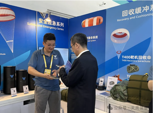 此次展出的空降空投系列产品主要包含T175系列人用降落伞系统、T300系列伞兵伞系统及T500系列物资空投系统等。其中T175-280型人用降落伞系统近期完成了万米高空跳伞,以12991米的跳伞高度突破了国产伞降装备的最高纪录,验证了“天鹰智造”伞降系统的技术先进性,让观众近距离体验中国降落伞安全系统的创新力量,也共同见证天鹰装备在航空安全保障技术上的前沿突破。
