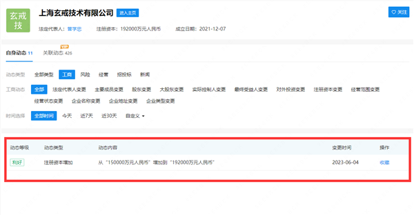 据企查查官网显示,日前,上海玄戒技术有限公司发生工商变更,公司注册资本由15亿元增至19.2亿元。