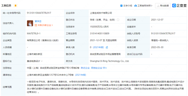 该公司成立于2021年,经营范围包括电子科技、通信科技、信息科技、半导体科技领域内的技术服务、技术开发、技术咨询、技术转让;信息技术咨询服务;信息系统集成服务;集成电路芯片设计及服务;集成电路芯片及产品销售;集成电路设计等,由X-Ring Limited全资控股。