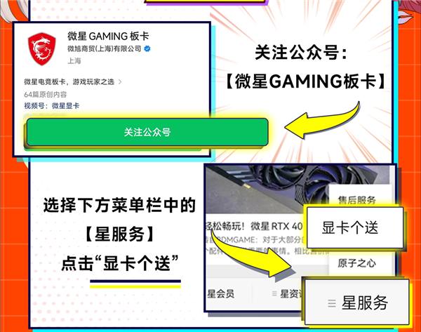 微星GAMING板卡公众号:首先关注“微星GAMING板卡”公众号,在公众号下方的菜单栏【星服务】中选择【显卡个送】,点击进入申请界面。