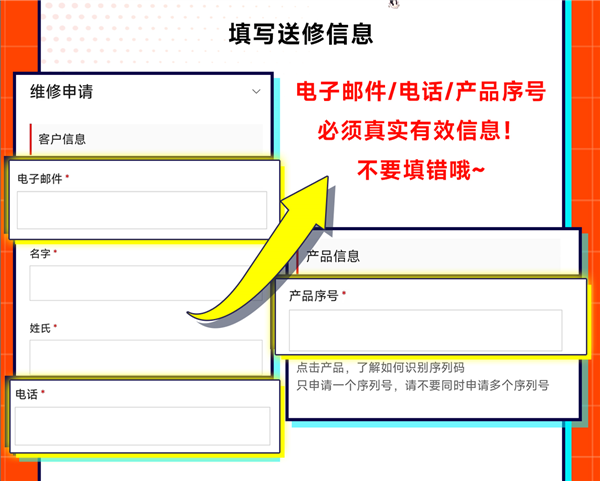 填写维修申请,根据维修申请单中的要求完成各项信息的填写,其中电子邮件、电话、产品SN序号务必填写真实有效的信息,方便与您联系,避免出现不必要的麻烦。