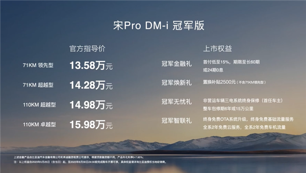 快科技5月25日消息,比亚迪宋Pro DM-i冠军版正式上市,共推出4款车型,售价区间为13.58-15.98万元 ,同时推出了购车政策,详情见下图。