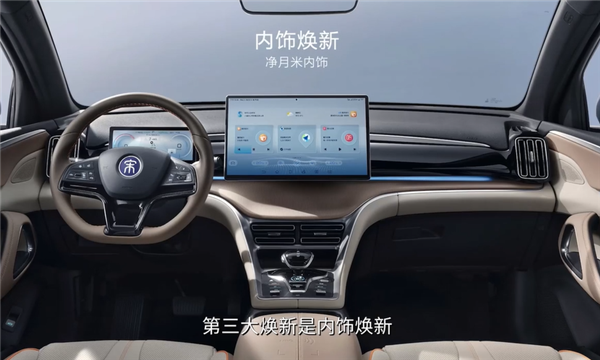 内饰提供全新“净月米”内饰配色,感受静谧环抱式智能座舱,从官图看,宋Pro DM-i将使用撞色内饰,中控台上部分为黑色,下方则是褐色和米白拼接,配合车内氛围灯、大尺寸的液晶仪表盘和中控屏,整体氛围十分富有时尚感。