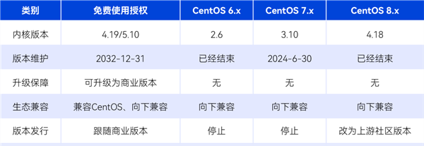 免费使用授权和CentOS在内核版本和版本维护等方面有一定的差异。