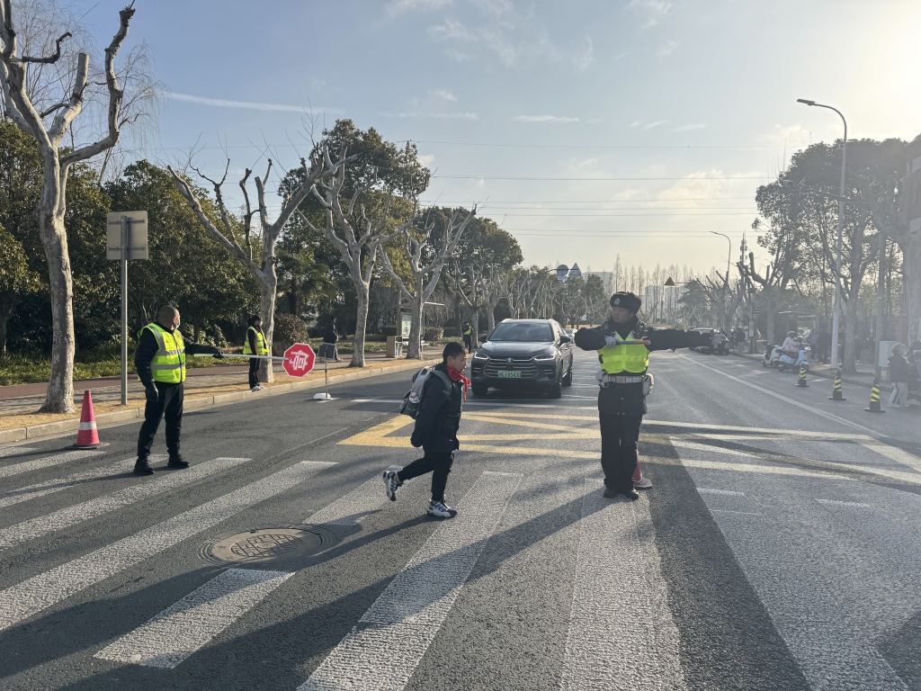 7点40分,在进才实验小学西校门口,浦东交警支队五大队交警在车流中穿梭指挥,引导送学车辆即停即走;身着志愿者马甲的家长志愿者手持提示牌,协助维护秩序。