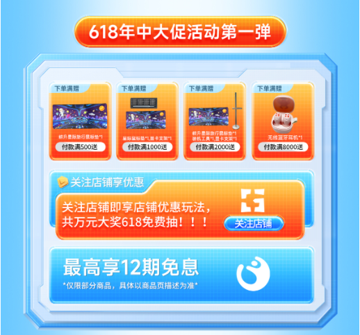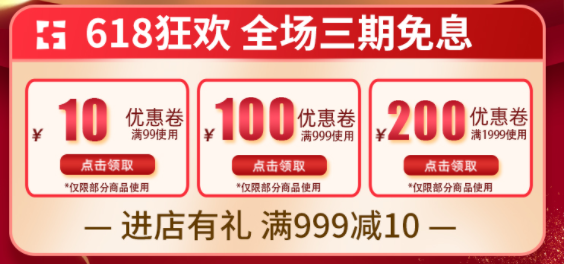 618期间全场享受三期免息分期付款,店铺同时享受满99-10、满999-100、满1999-200(部分产品可用)的限时优惠,优惠实在、产品多多,赶快把心仪的电脑配件带回家吧!