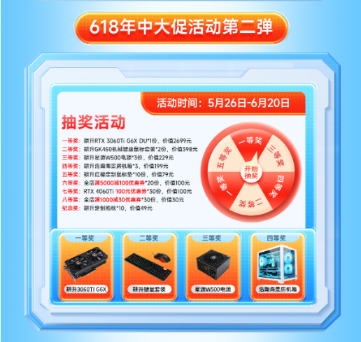 年中大促活动第二弹,关注店铺参与消费后可以参与618活动抽奖,最高可获得价值2699元的耕升 GeForce RTX 3060 Ti G6X DU 一张,福利满满快来参加吧!