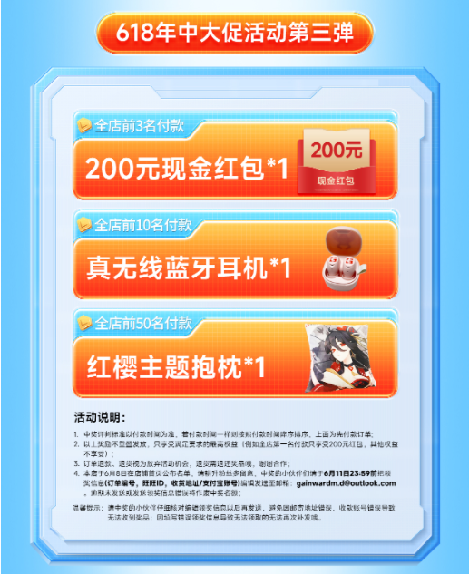 年中大促活动第三弹,活动期间消费前三名的客户即可享受200元的现金红包奖品,前十名可获得耕升蓝牙耳机一款,前50名获得耕升红樱主题抱枕一个。