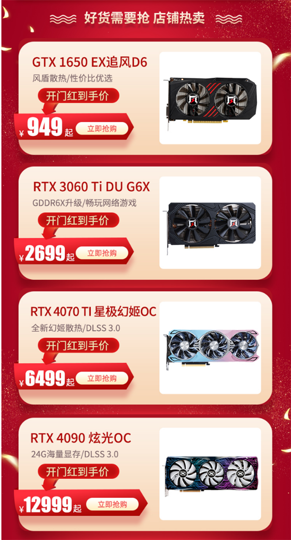 店铺内此次也有多款值得入手的产品,进行了优惠售卖,其中包括耕升 GeForce GTX 1650 EX追风 D6、耕升 GeForce RTX 4090 炫光 OC、耕升 GeForce RTX 4070 Ti 星极幻姬 OC等,其中耕升 GeForce RTX 4090 炫光 OC 作为耕升 GeForce RTX 40系列的“卡皇”,为玩家带来最为强劲的游戏体验。玩家在享受618开门红优惠的同时,为玩家的性能需求保驾护航。