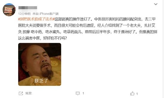 一些网友们看到这些电视剧中的情节感到大为不解,称“别把医术拍成了法术”。