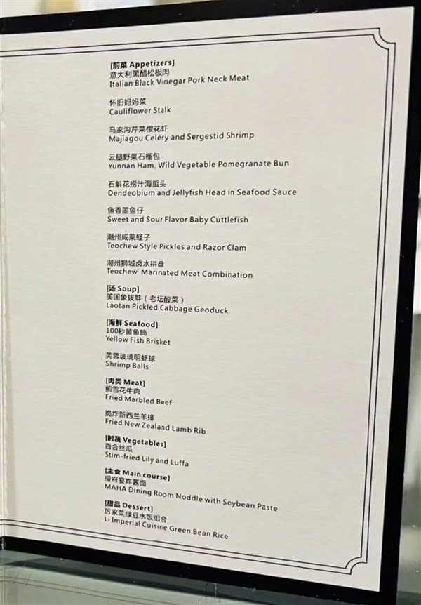菜品方面,晚宴共有16道菜,分为前菜、汤、海鲜、肉类、时蔬、主食、甜品7大类,包括意大利黑醋松板肉、怀旧妈妈菜、马家沟芹菜樱花虾、美国象拔蚌(老坛酸菜)、缦府宴炸酱面等。