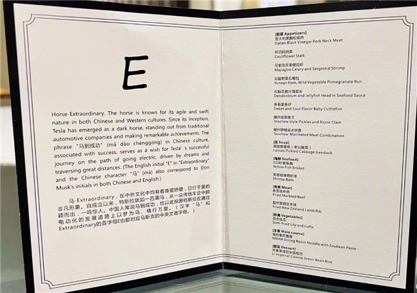 菜单内页字母“E”十分醒目,并用中英双语介绍了“马”的含义,以及祝愿特斯拉在通往电动化的发展道路上以梦为马、横行万里。