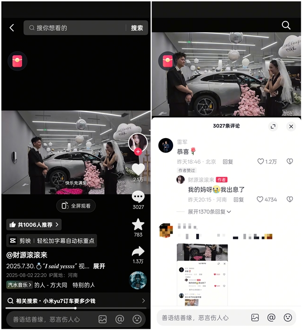 一位女生发布视频,在小米YU7交付现场,她被男友求婚。